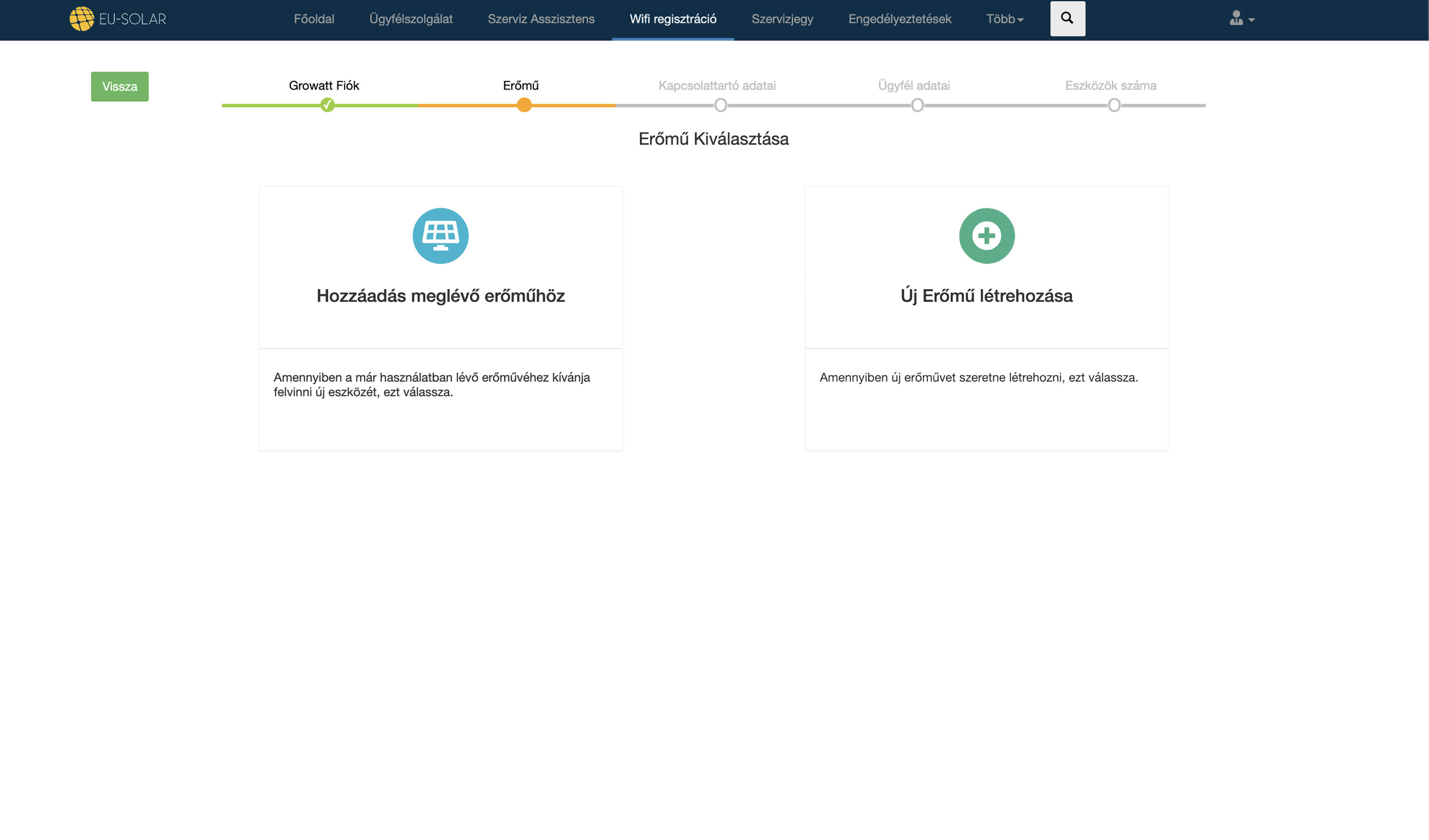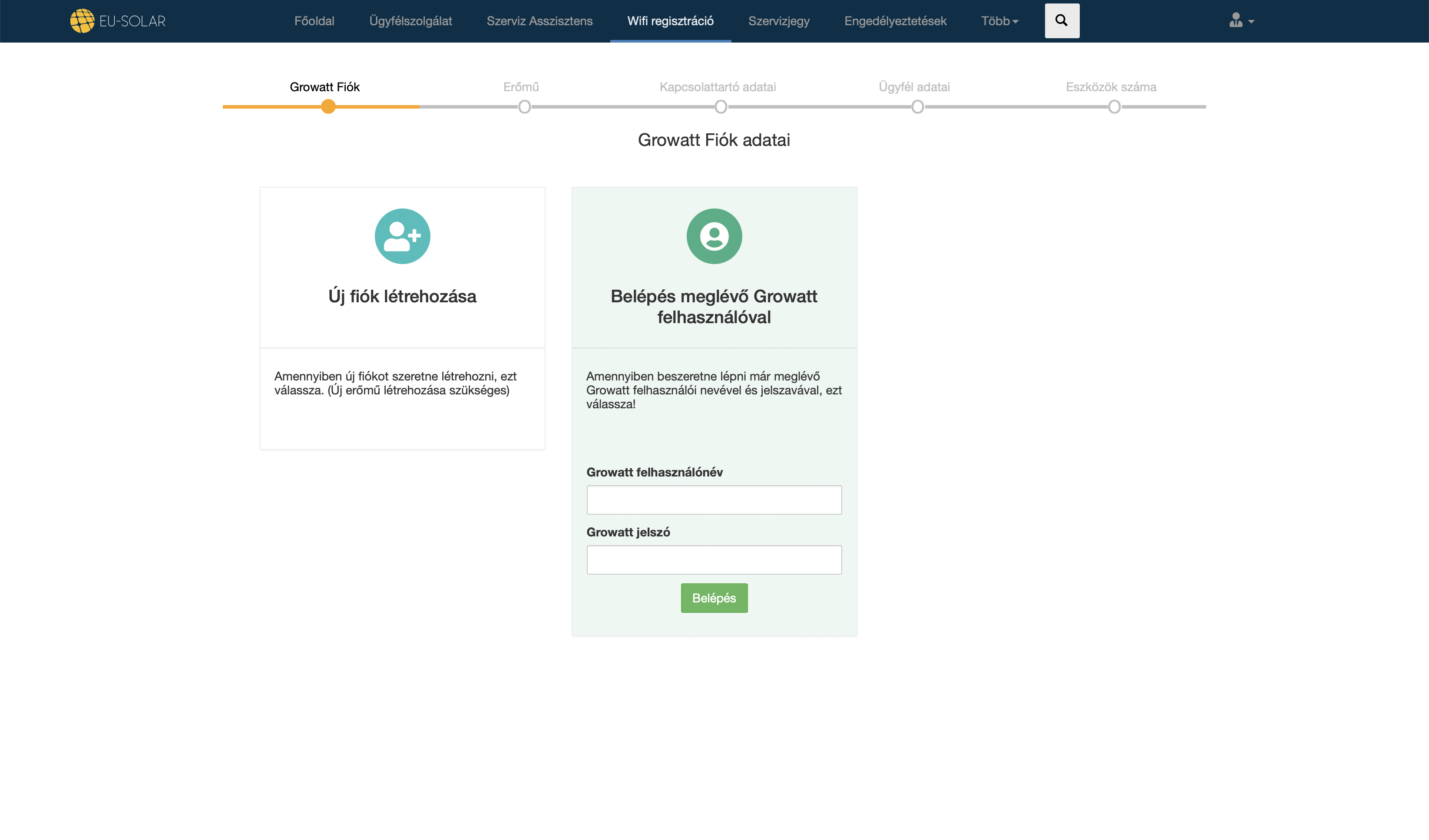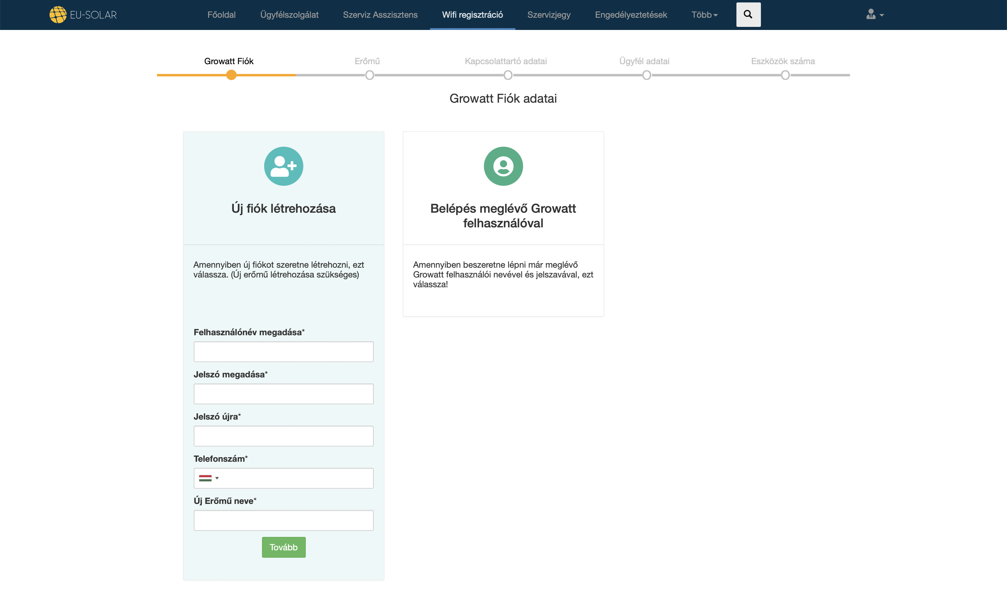 2. Ezután válasszuk ki, hogy új vagy már meglévő Growatt fiókhoz szeretnénk hozzáadni. “Új fiók létrehozása” esetén adjuk meg a választott felhasználónevet, a jelszót, a telefonszámot és az erőmű nevét: