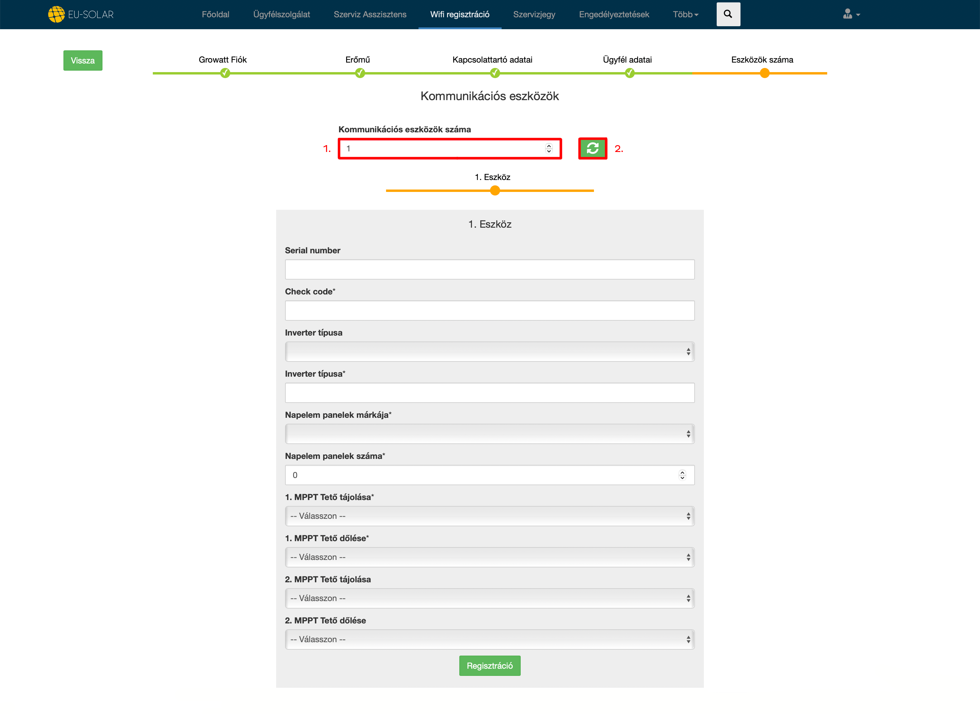5. Ezután adjuk meg, mennyi kommunikációs eszközünk van (1), hogy a frissítés gomb (2) megnyomása után ennek megfelelő számú űrlap jelenjen meg. Az eszközről/eszközökről leolvasott adatokat vigyük fel a rendszerbe: